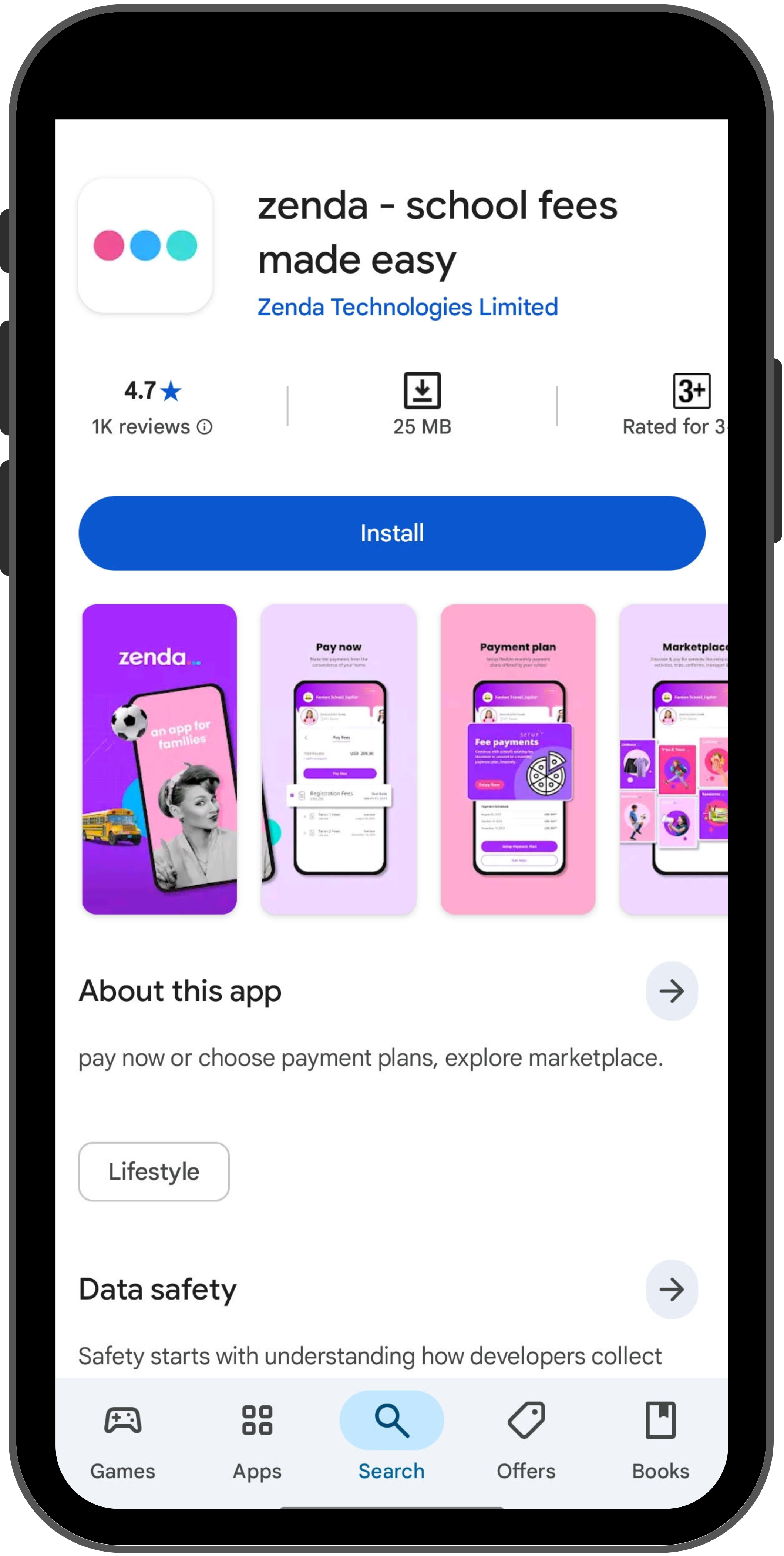 Step 1: If you don't have the zenda app, download it from from the App Store (for iOS) or Google Play Store (for Android), or use app.zenda.com/getstarted to download zenda app directly.